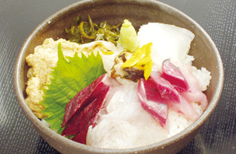 | 奥能登で獲れた魚や海草がふんだんに盛り込まれた丼。小木地区特産のイカの内臓を使ってつくる「ナメナメ」といしるの割醤油はこの地域ならでは。 |